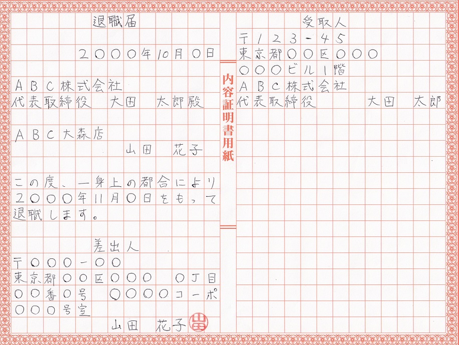 未分類この記事では、参考図書を基に内容証明郵便用紙を使用した退職届の書き方の一例を記します。 内容証明郵便とは 内容証明郵便とは差出人が同じ内容の郵便物を3通作成し、1通を相手側へ送り1通を郵便局が保存、もう1通を差出人の手元...